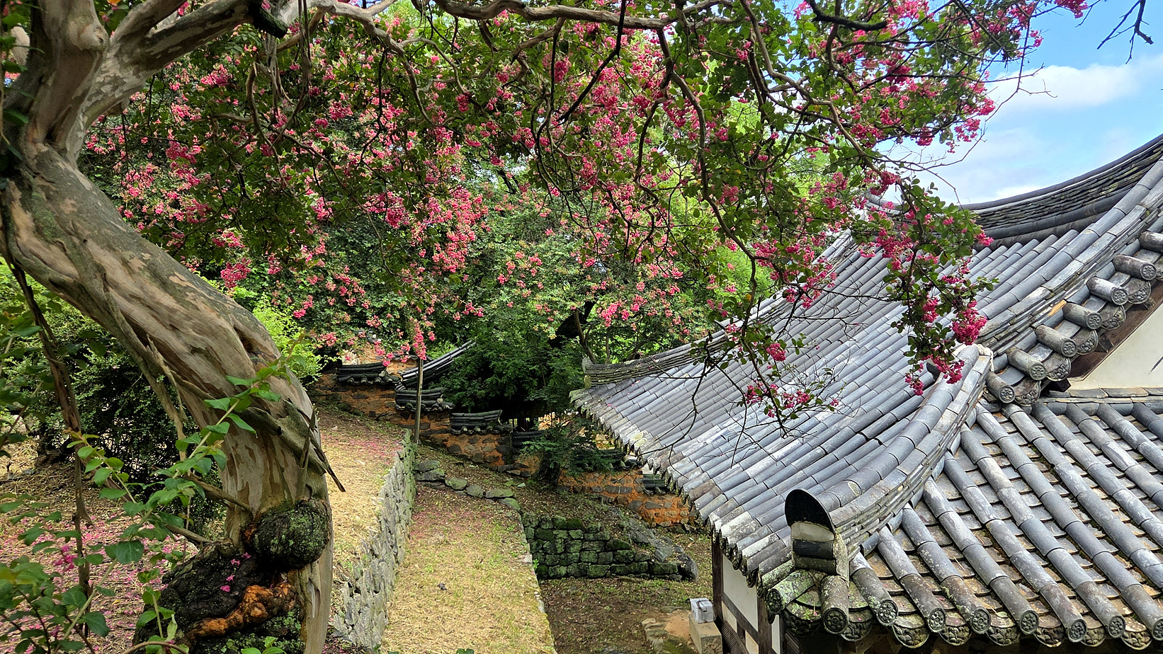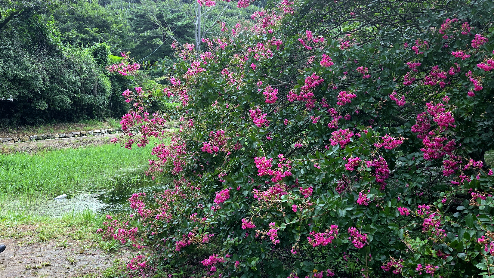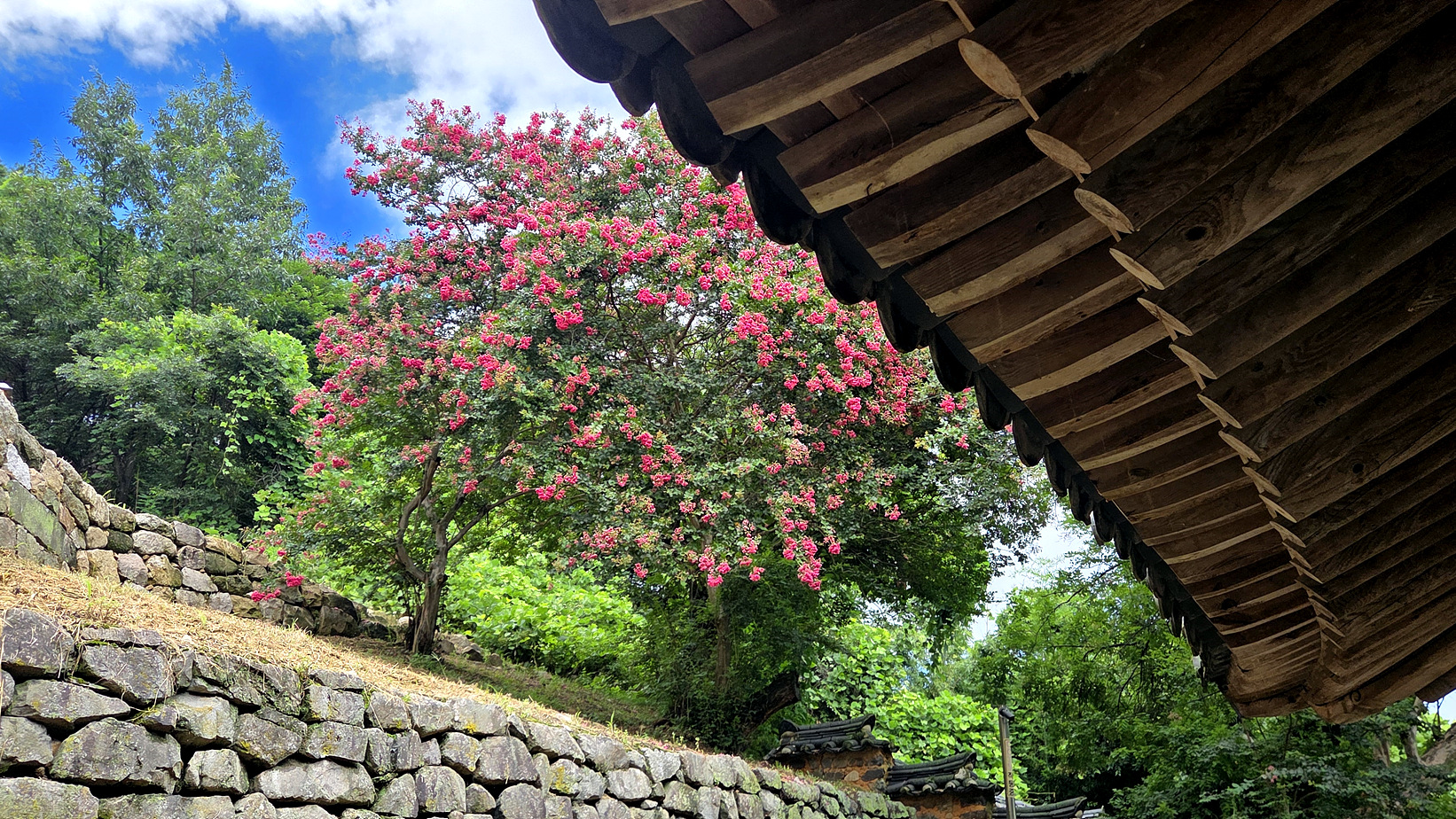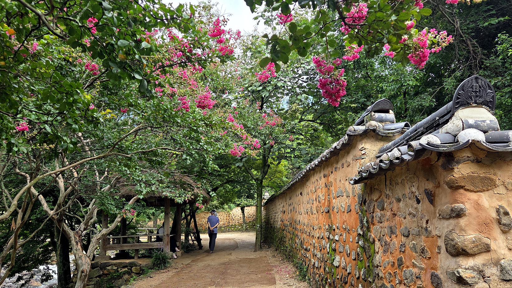 돌담길과 배롱나무꽃의 조화 멋지네요.