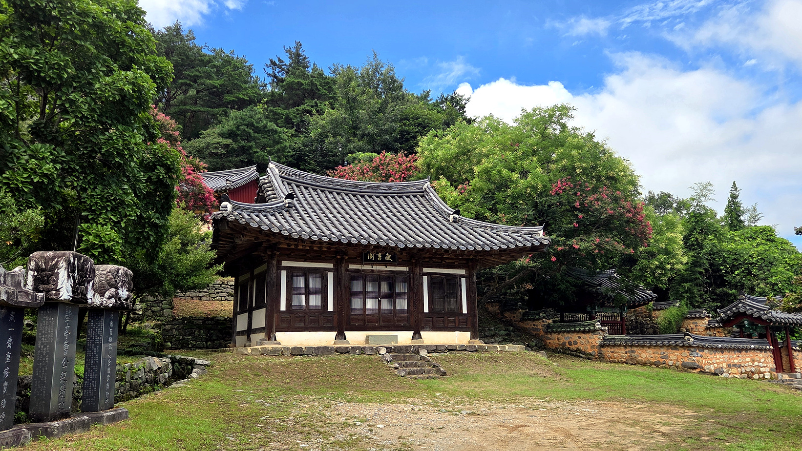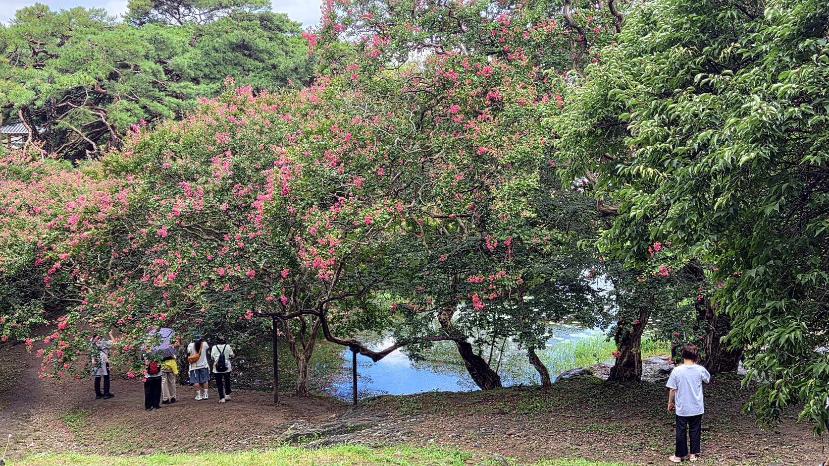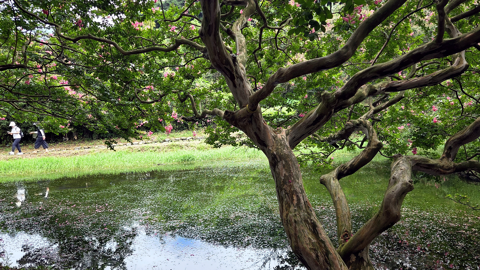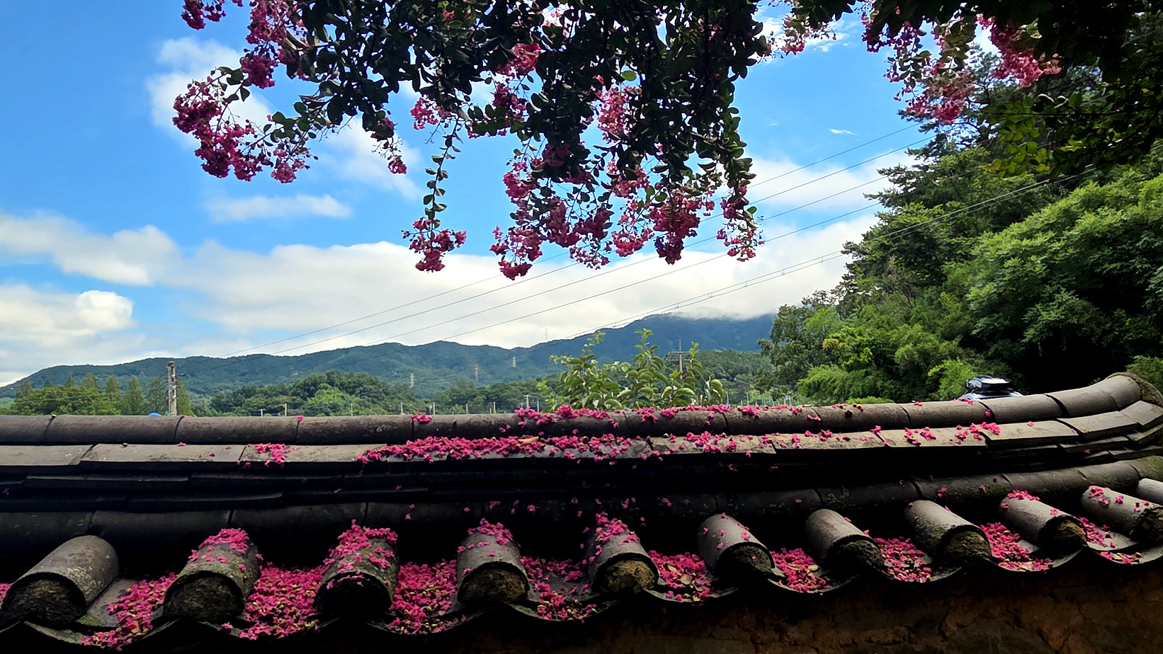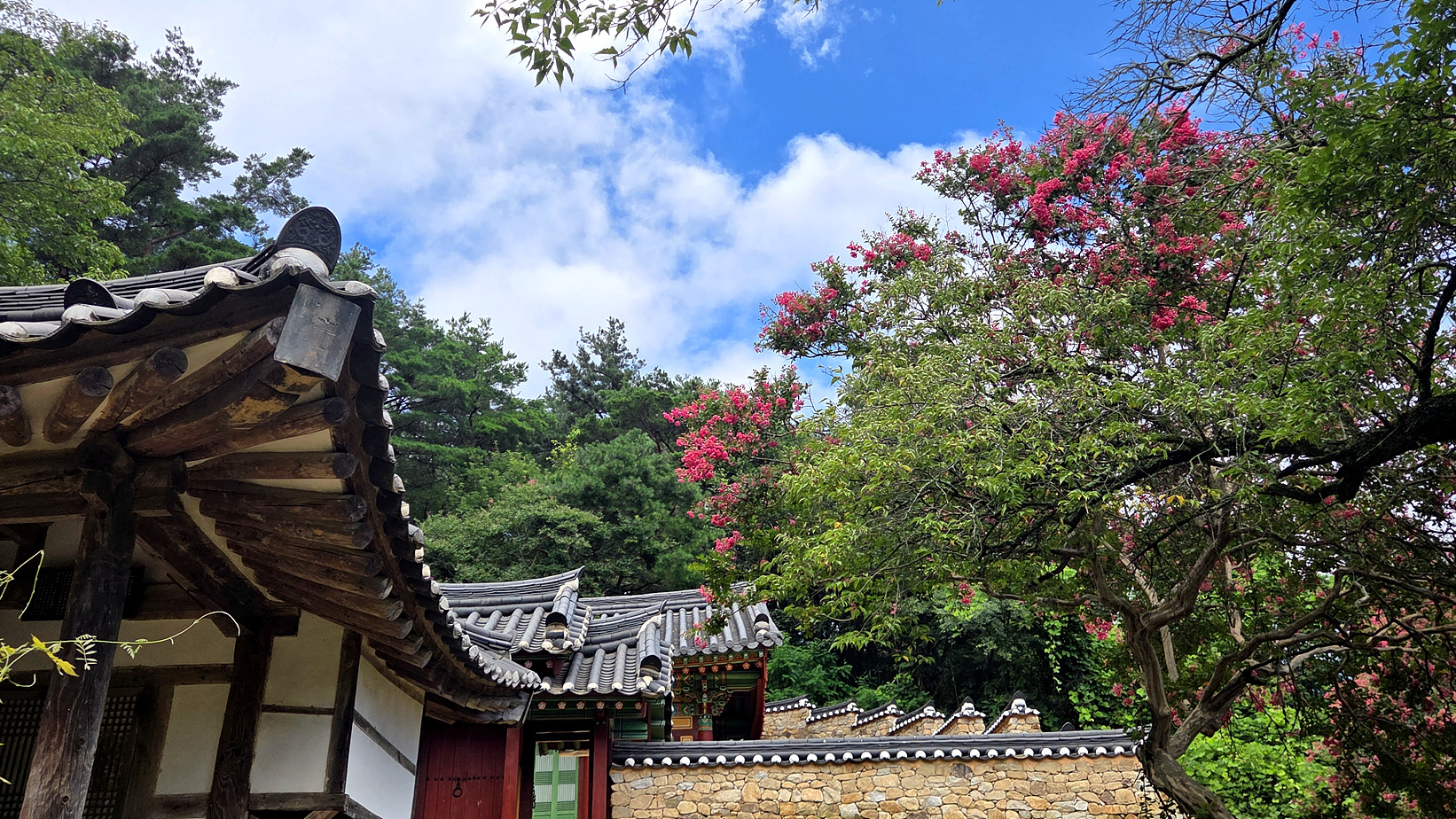 돌담길과 배롱나무꽃의 조화 멋지네요.