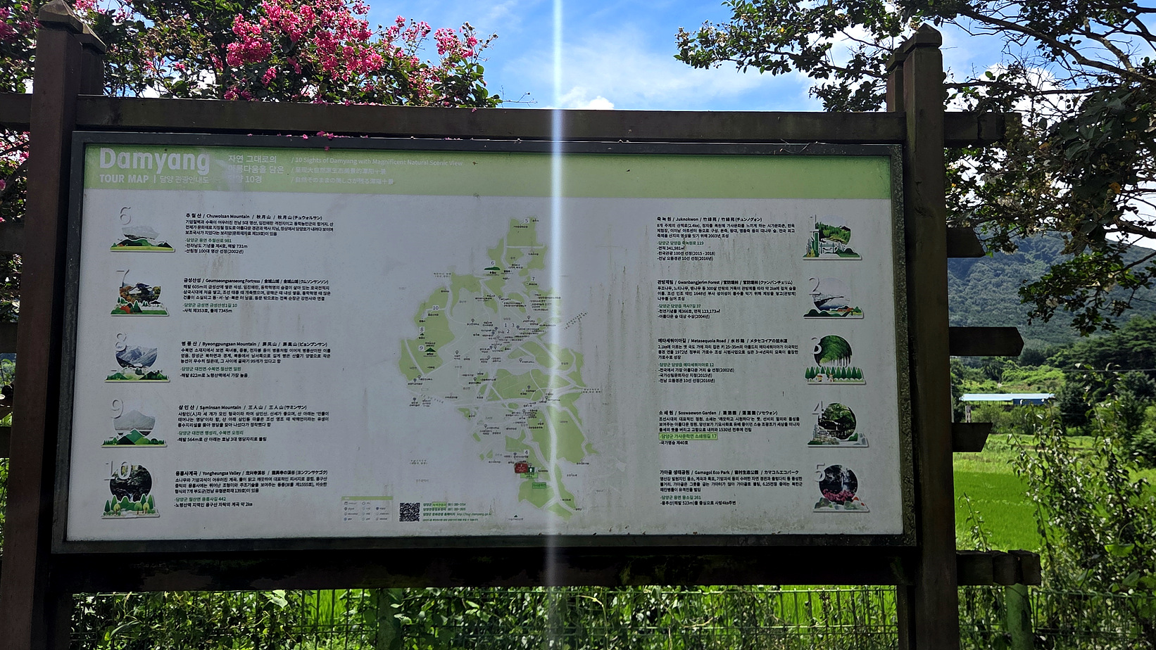 카페 안내판이 특이하게 설치되어 있다. 명옥헌 원림에 들어가 위해 주차장에서 혜경이를 기다리며 배롱나무꽃을 찍어본다.