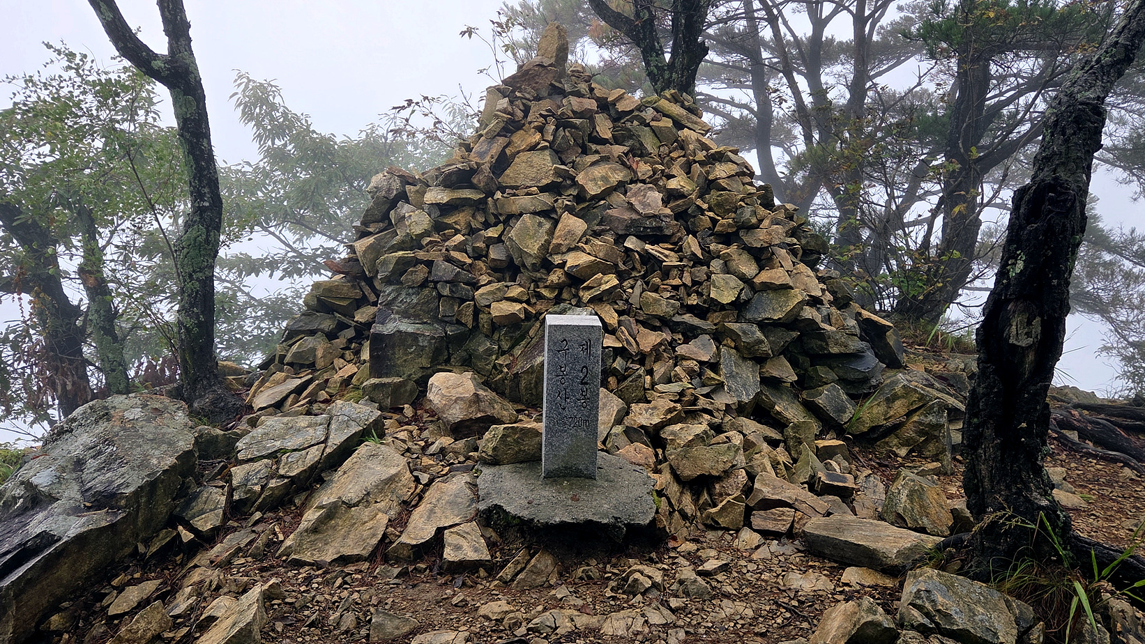 비가 내려 구름속이라 조망은 꽝입니다. 힘들게 주능선에 올라섰네요. 제1봉은 이곳에서 진행반대방향으로 갔다가 다시 돌아와야 됩니다. 생략하고 지나갑니다.