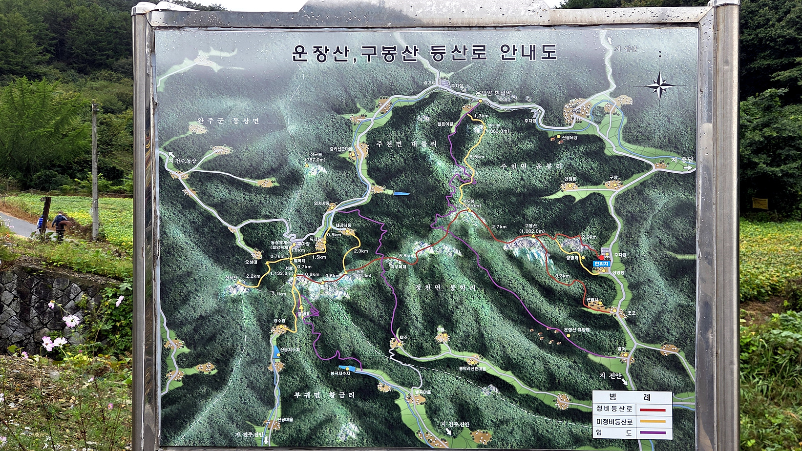 주차장에 설치되어 있는 운장산, 구봉산 등산로 안내도