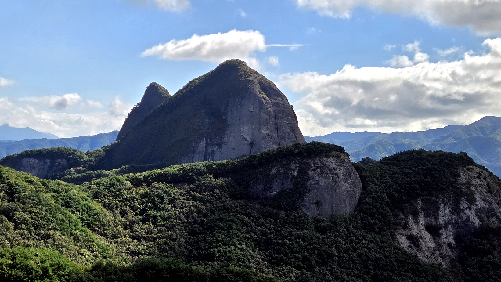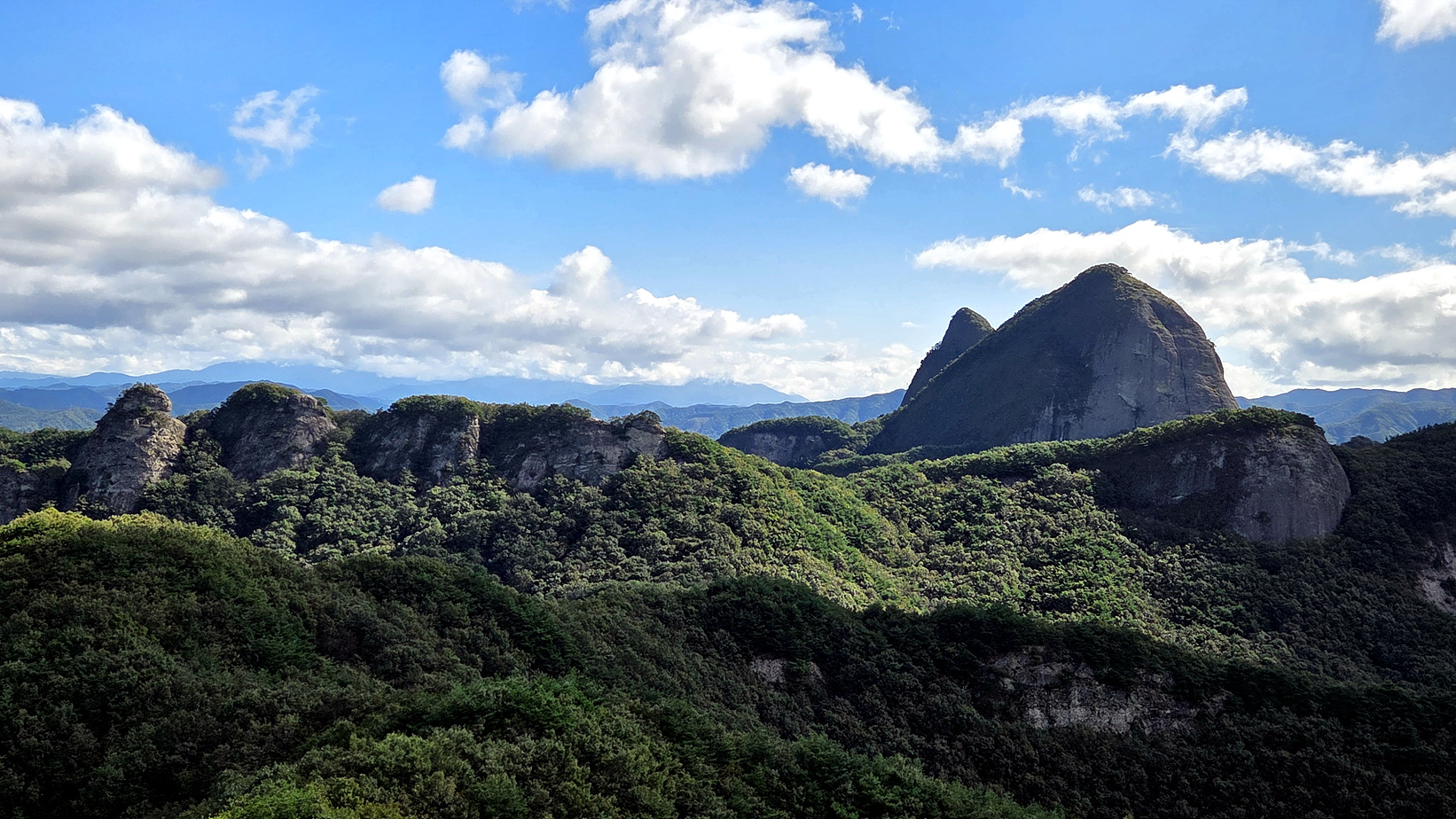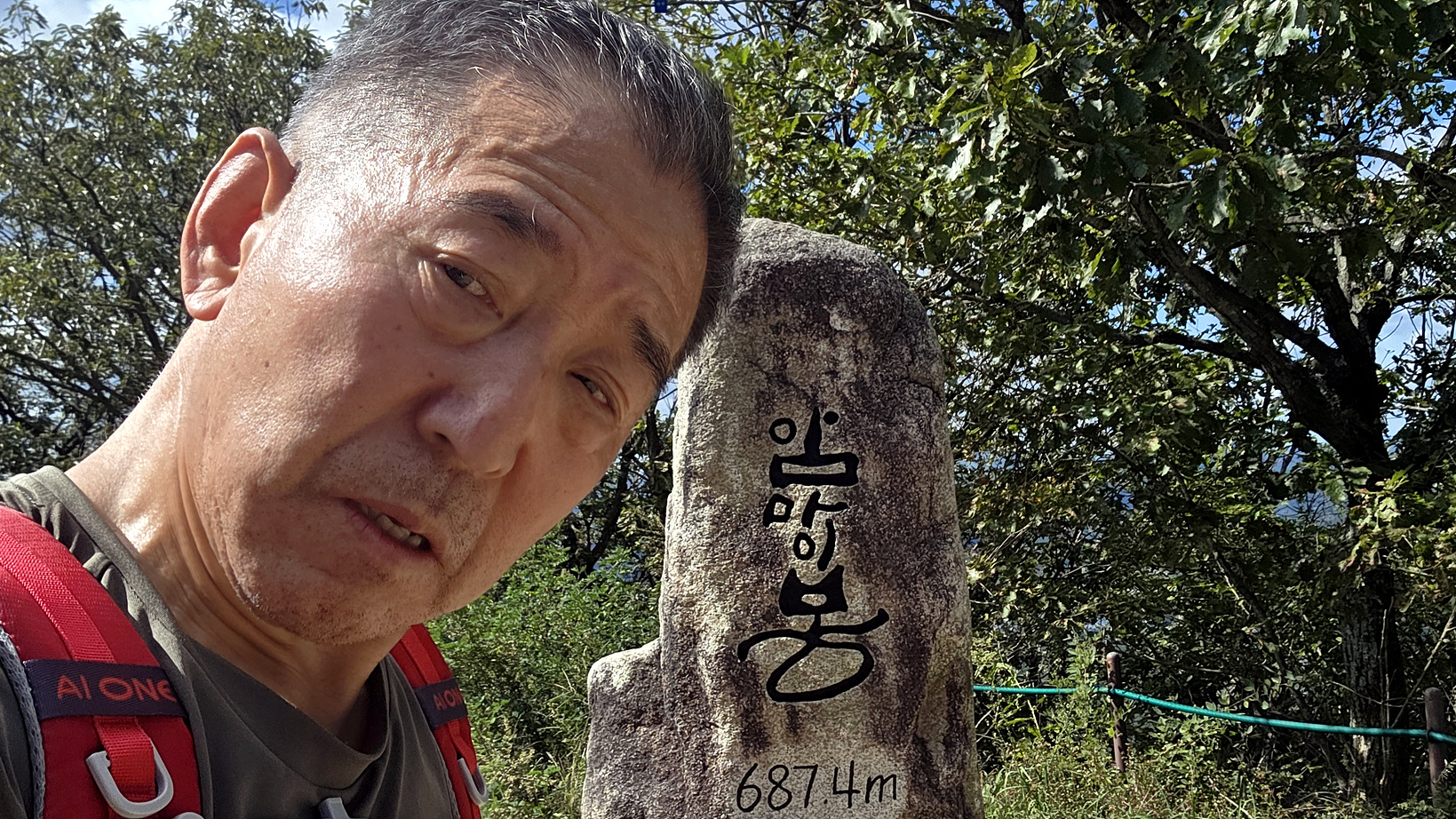 봉두봉 정상, 아래 암벽이 옛날에 암벽 하던 알바위다. 암벽등반 금지라는 플래카드가 많이 걸려있다. 금남호남정맥 능선이며 부귀산으로 이어진다. 이곳에서 쉬면서 후미와 합류 힘들어하는 샘물님은 바로 내려가라 하고 둘이서 먼저 출발합니다.