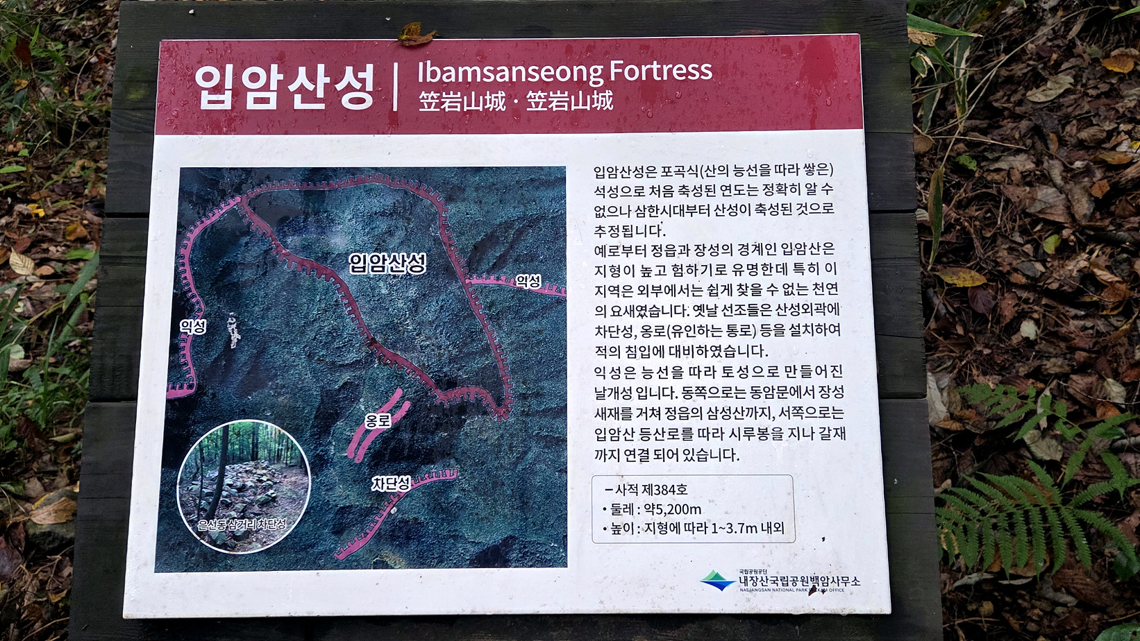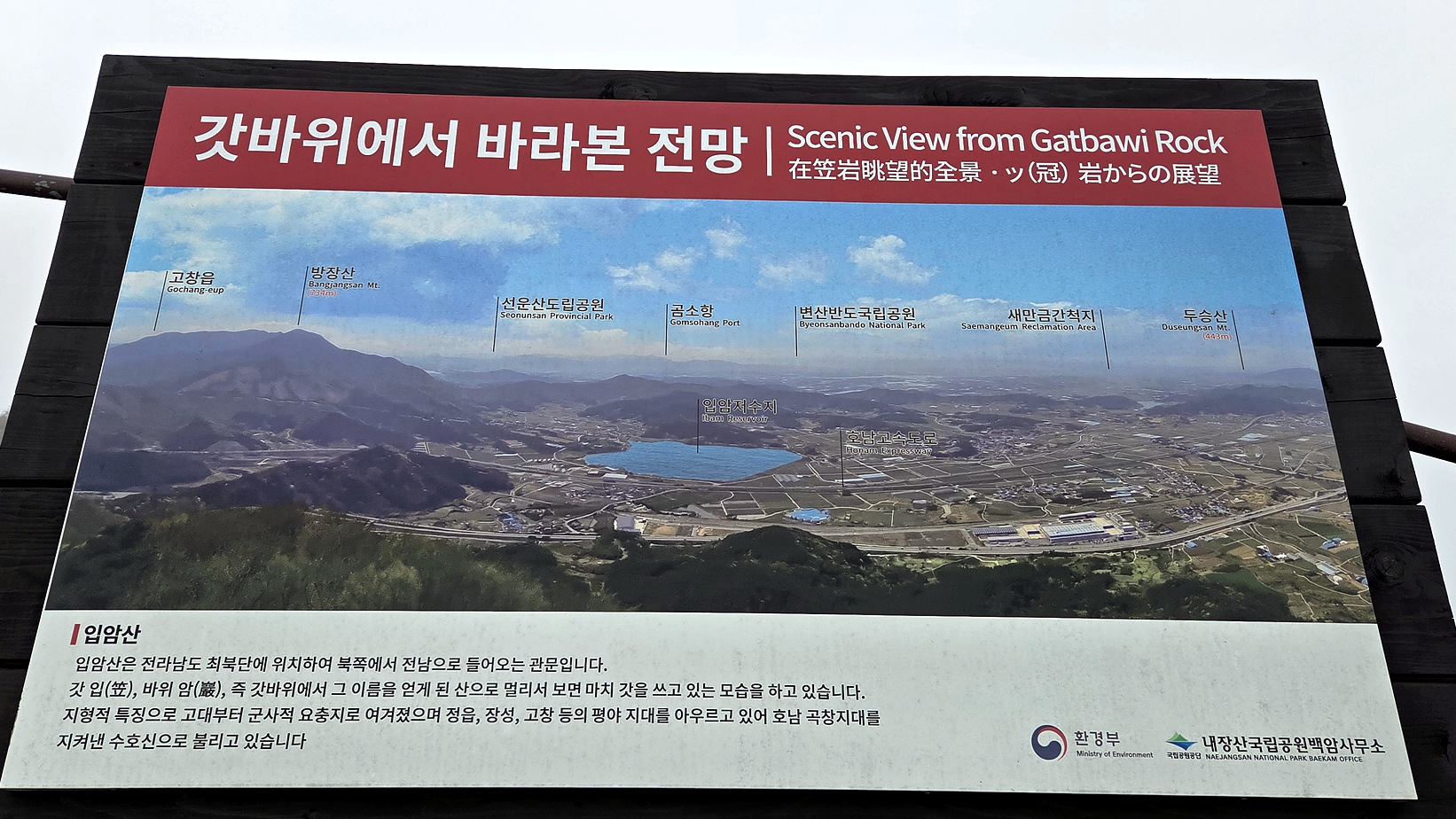입암산은 전라남도 최북단에 위치하여 북쪽에서 전남으로 들어오는 관문이다. 갓 입(笠) 바위 암(巖), 즉 갓바위에서 그 이름을 얻게 된 산으로 멀리서 보면 마치 갓을 쓰고 있는 모습을 하고 있습니다. 지형적 특징으로 고대부터 군사적 요충지로 여겨졌으며 정읍, 장성, 고창 등의 평야 지대를 아우르고 있어 호남 곡창지대를 지켜낸 수호신으로 불리고 있습니다.(설명판 내용)
