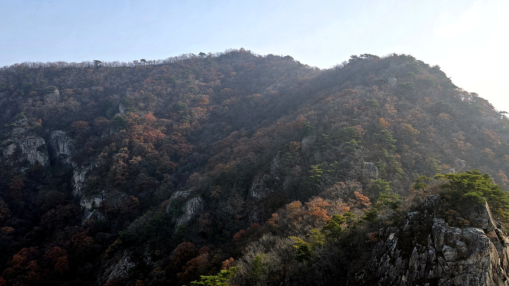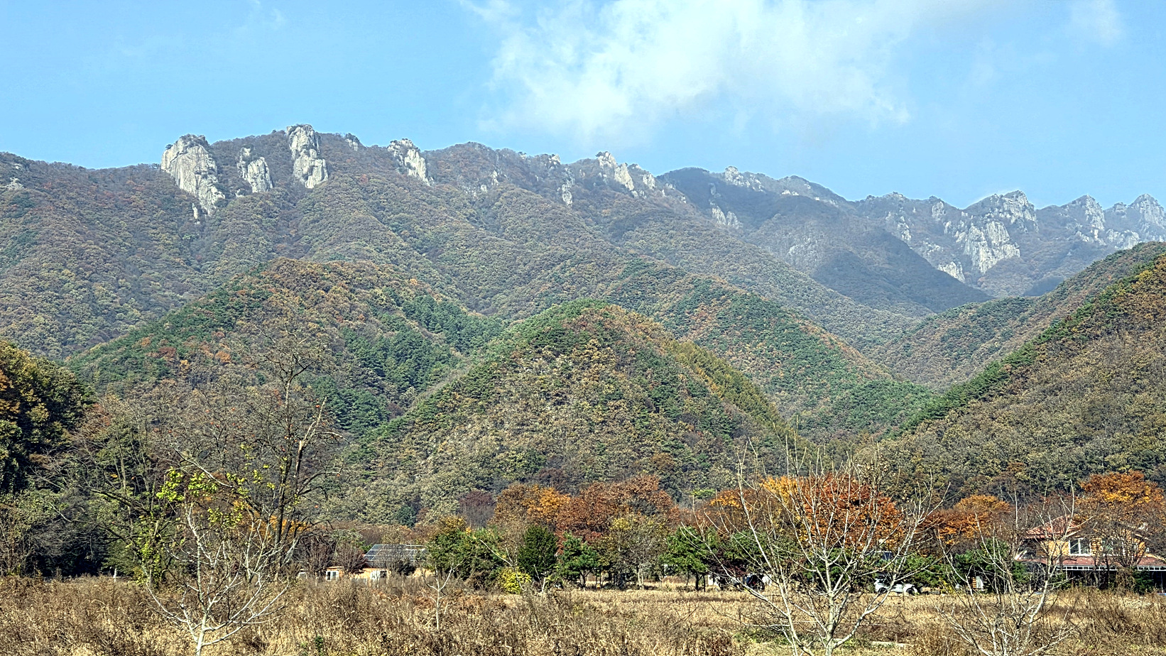 우리가 내려온 천등산 능선이 보입니다. 천등산은 릿지등반 하는 곳으로 유명한 곳이라 주말마다 전국에서 등반하러 많은 사람들이 오는 곳이다.
