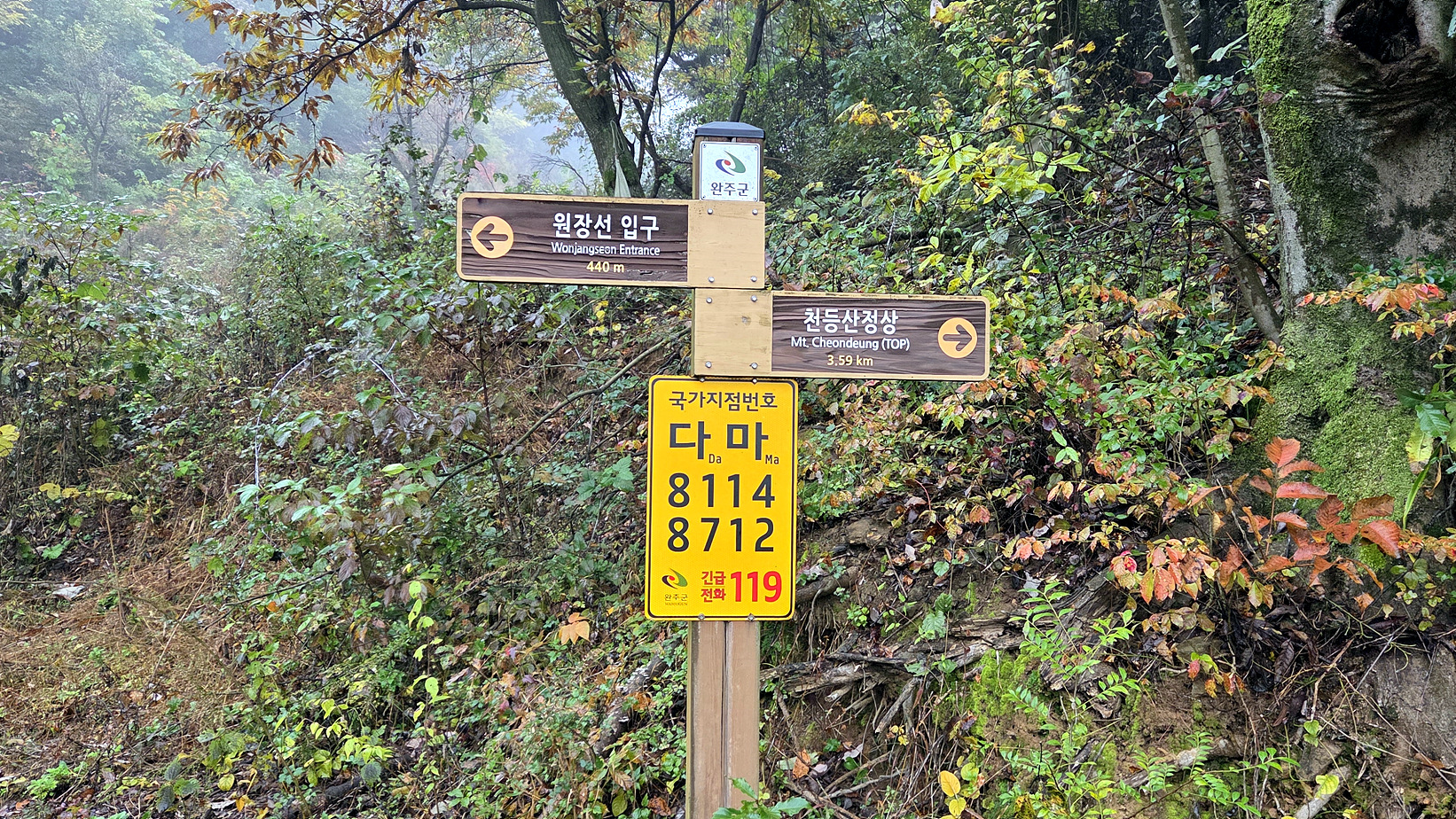 종학이는 릿지등반 이야기를 하더니 아침에 일어나 보니 언제 가버렸는지 보이지 않는다. 우연, 일성이 차를 타고 게임고등학교 있는 곳에서 좌회전해서 들어가면 원장선 마을에 천등산 등산로 입구라는 안내판이 보이네요.