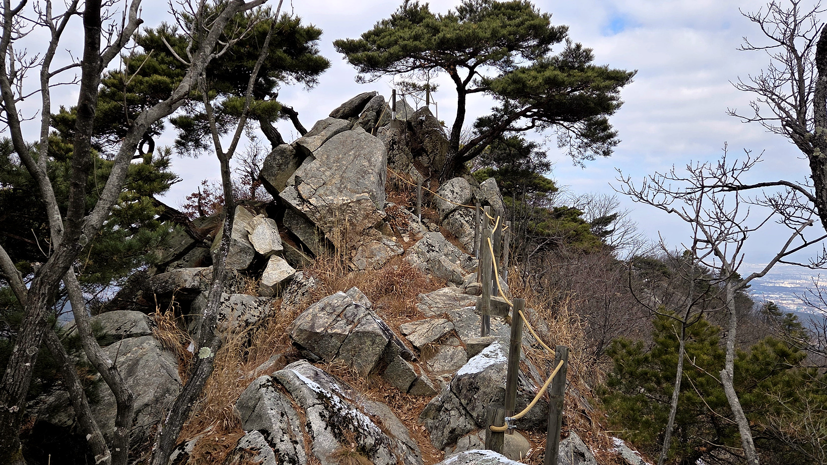 등산로 입구. 이곳으로 가면 암벽 구간이라 길이 없다고 생각했는데, 오늘 보니 나무사이로 데크계단이 보인다. 언제 한번 내려가 봐야겠다. 지도에는 표시돼 있지 않아 어디에서 끝나는지가 궁금하다.