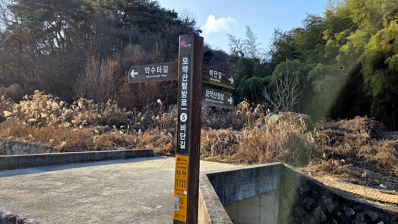 계곡길 삼거리, 이정표는 등산로 안쪽에 설치돼 있어 잘 보이지 않았는데, 철거하고 길 쪽에 새로 설치해 이제는 잘 보인다.