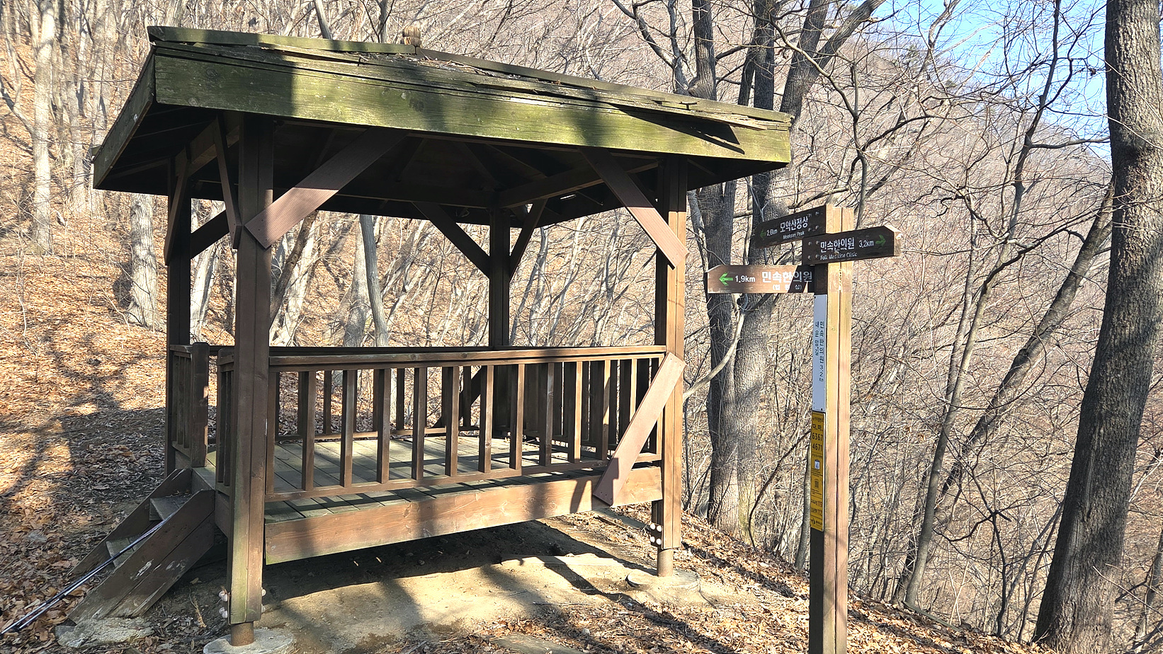 능선에 올라서면 정자가 보이고 이정표가 나타난다. 이 능선은 내운암길이다.