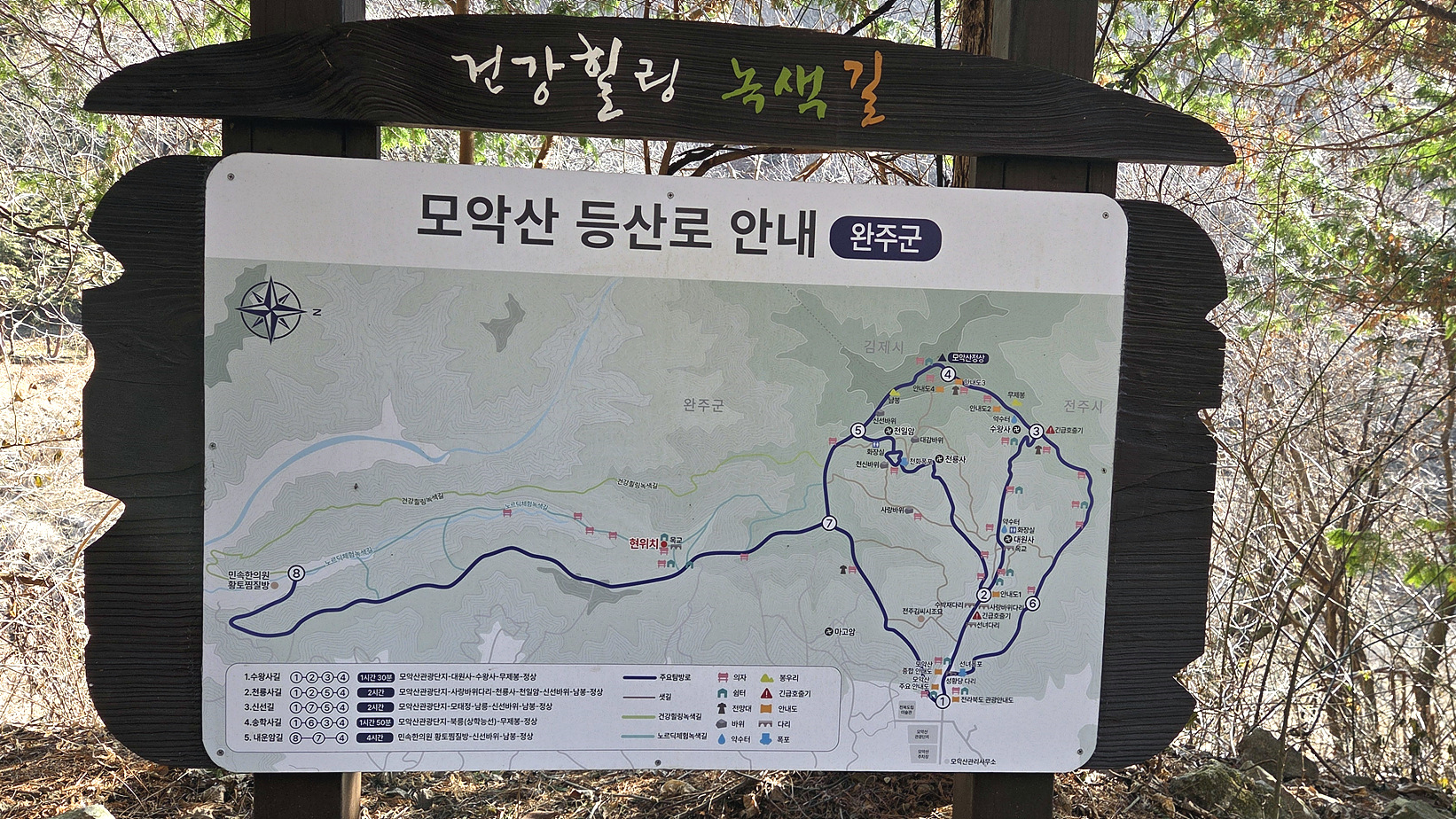 모악산 전코스 돌아보기 중, 완주군 쪽 길게 돌기를 마무리하기 위해 안덕마을로 들어가 안덕길(민속한의원~내운암~전망대~사랑바위다리)을 걷고 수왕사길(대원사~수왕사~모악산)로 모악산 정상을 오른 후 남봉을 거쳐 신선길로 내려오다 590봉에서 내운암길~민속환의원입원실 쪽으로 내려올 계획으로 시골소리 입구에 주차를 하고 산행을 준비해서 출발한다.