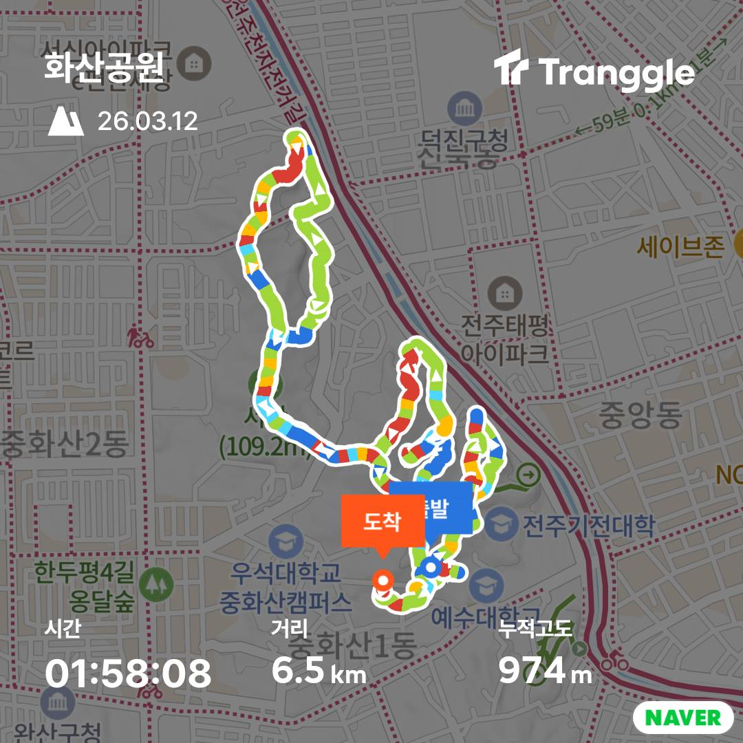 서신동 롯데아파트 입구에서 계단으로 올라 능선을 타고 집으로 돌아왔다. 트랭글을 확인해 보니 6.5km를 걸었다. 다음에는 나머지 길을 계속 걸어봐야겠다.
