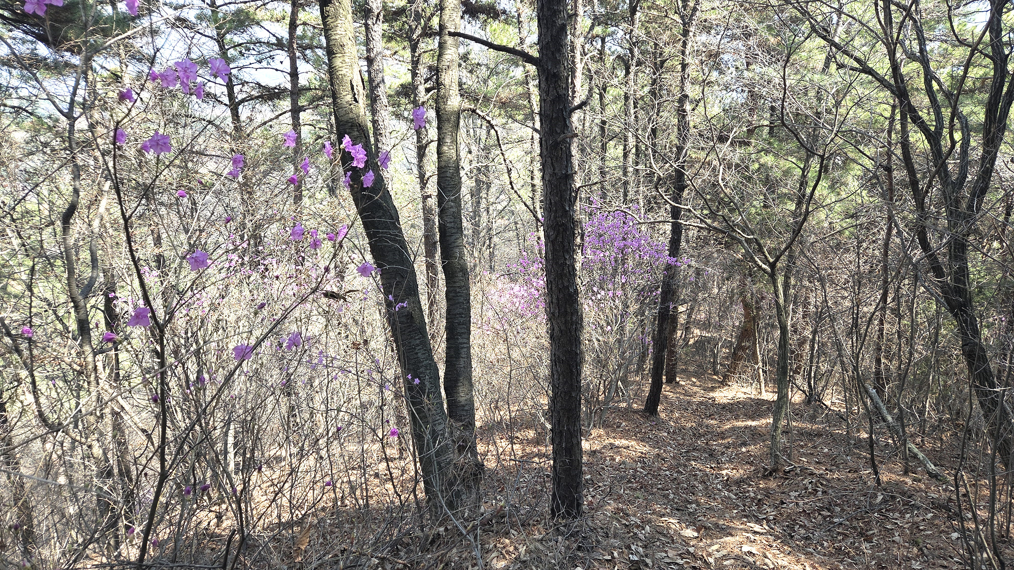 내려가는 길 사람이 다니지 않아 길이 완전하게 묵어서 이어가기가 힘들 정도네요. 중간에 진달래가 활짝 핀 구간이 나오네요.